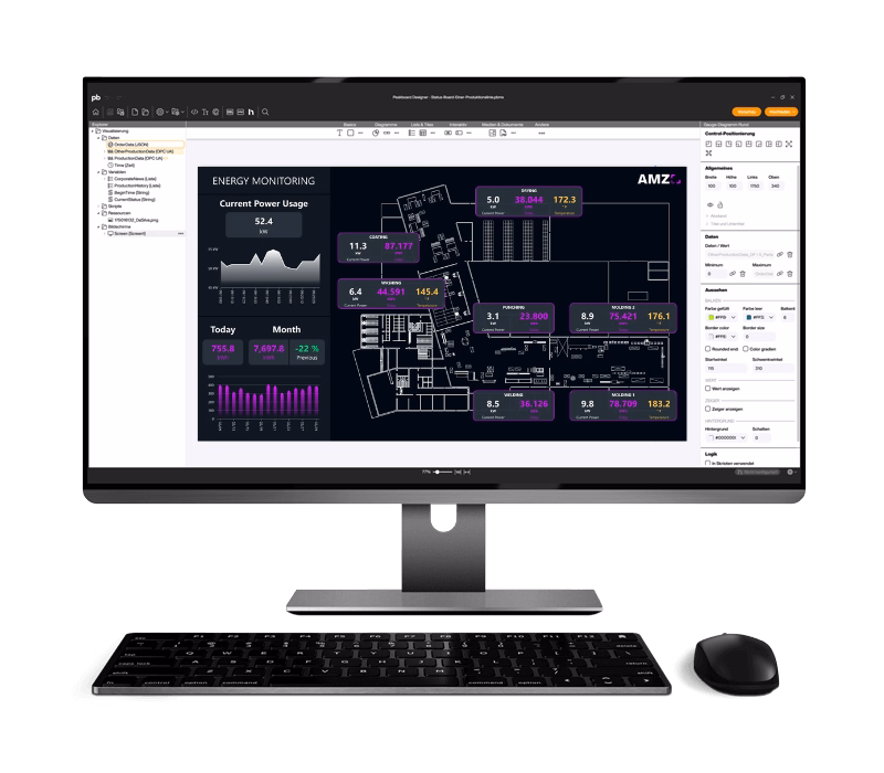 In Peakboard Designer, you can use a low-code interface to design individual dashboards, define key figures and adapt layouts to your corporate design. All energy consumption data is presented clearly — in real time and regardless of location.