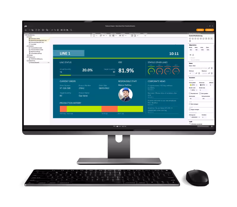 - Easy integration: Peakboard can be easily integrated into existing IT systems such as ERP or MES so that you can process all relevant data in real time.