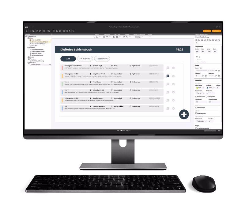 Erstelle dein digitales Schichtbuch und verwalte Schichtdaten schnell und sicher. Mit unserem Template kannst du Schichtdaten direkt auf einem Touchscreen oder Dashboard erfassen und alle relevanten Informationen in Echtzeit visualisieren – ganz ohne Programmierkenntnisse.