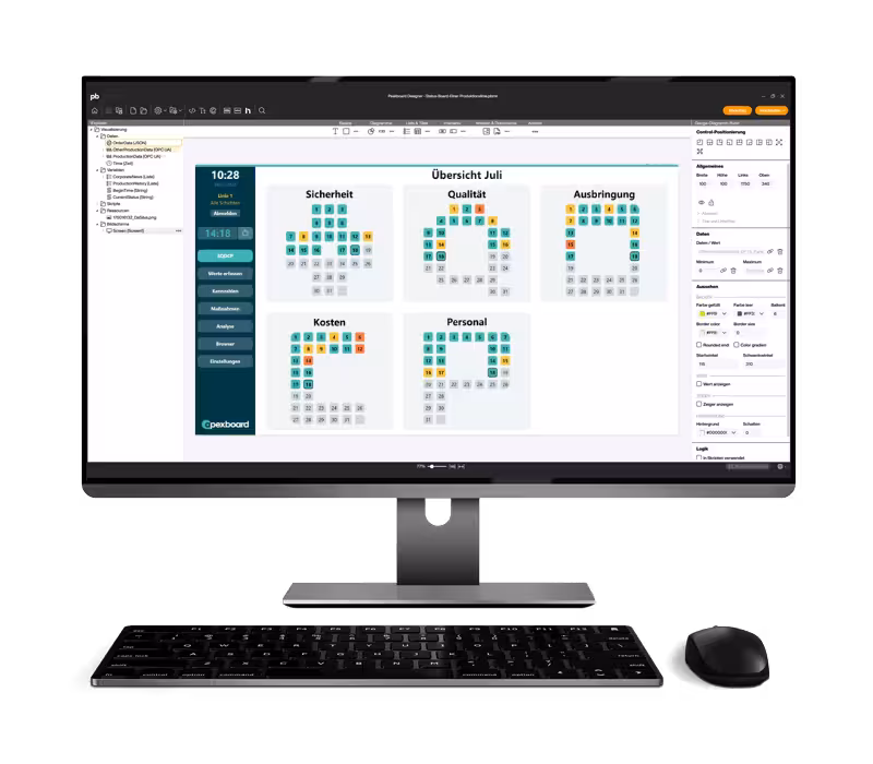 - Datenintegration: Peakboard lässt sich problemlos mit bestehenden Systemen (z. B. SAP, MES, SQL) verbinden. Alle relevanten Produktionsdaten werden in Echtzeit integriert und visualisiert.